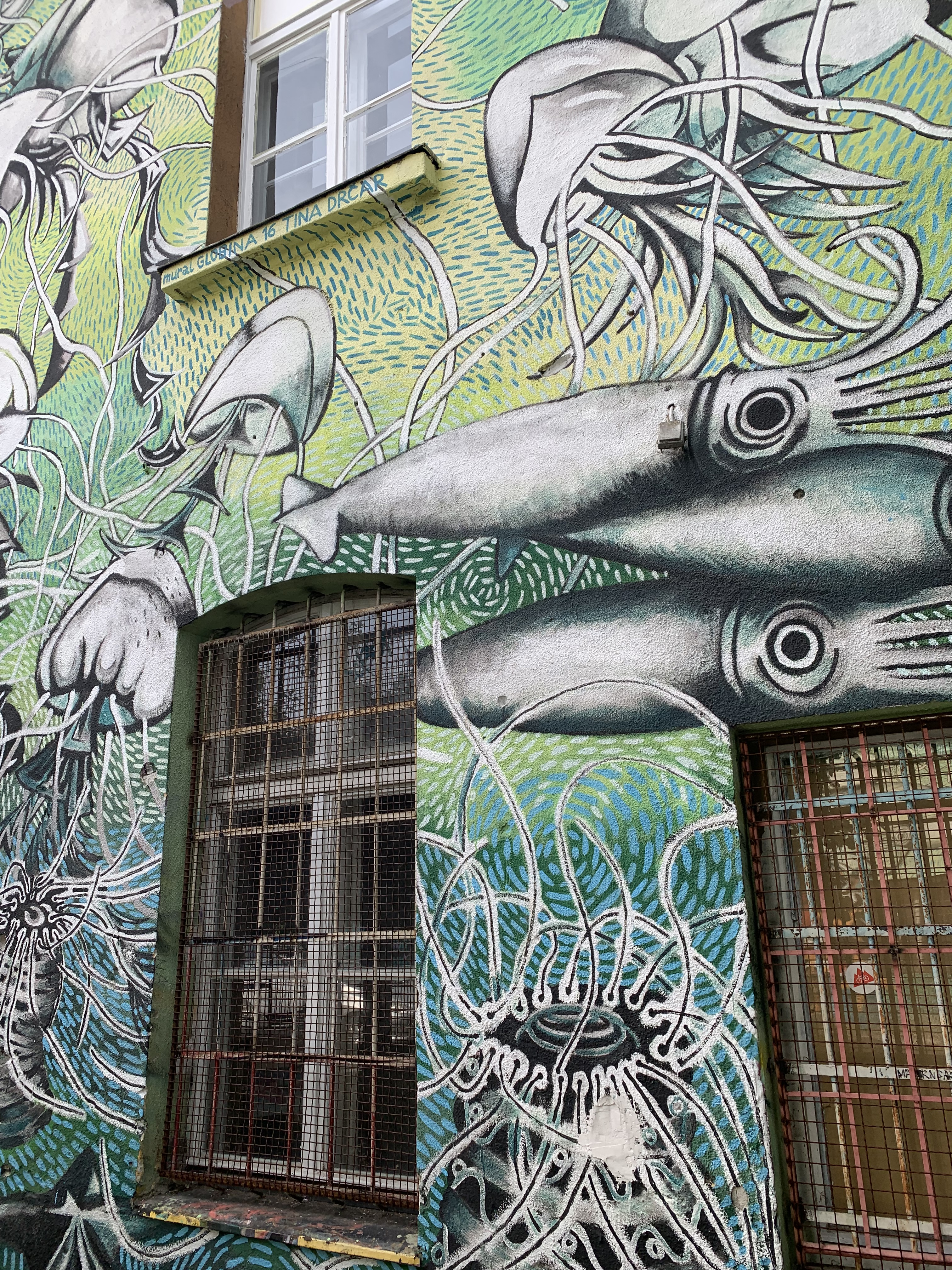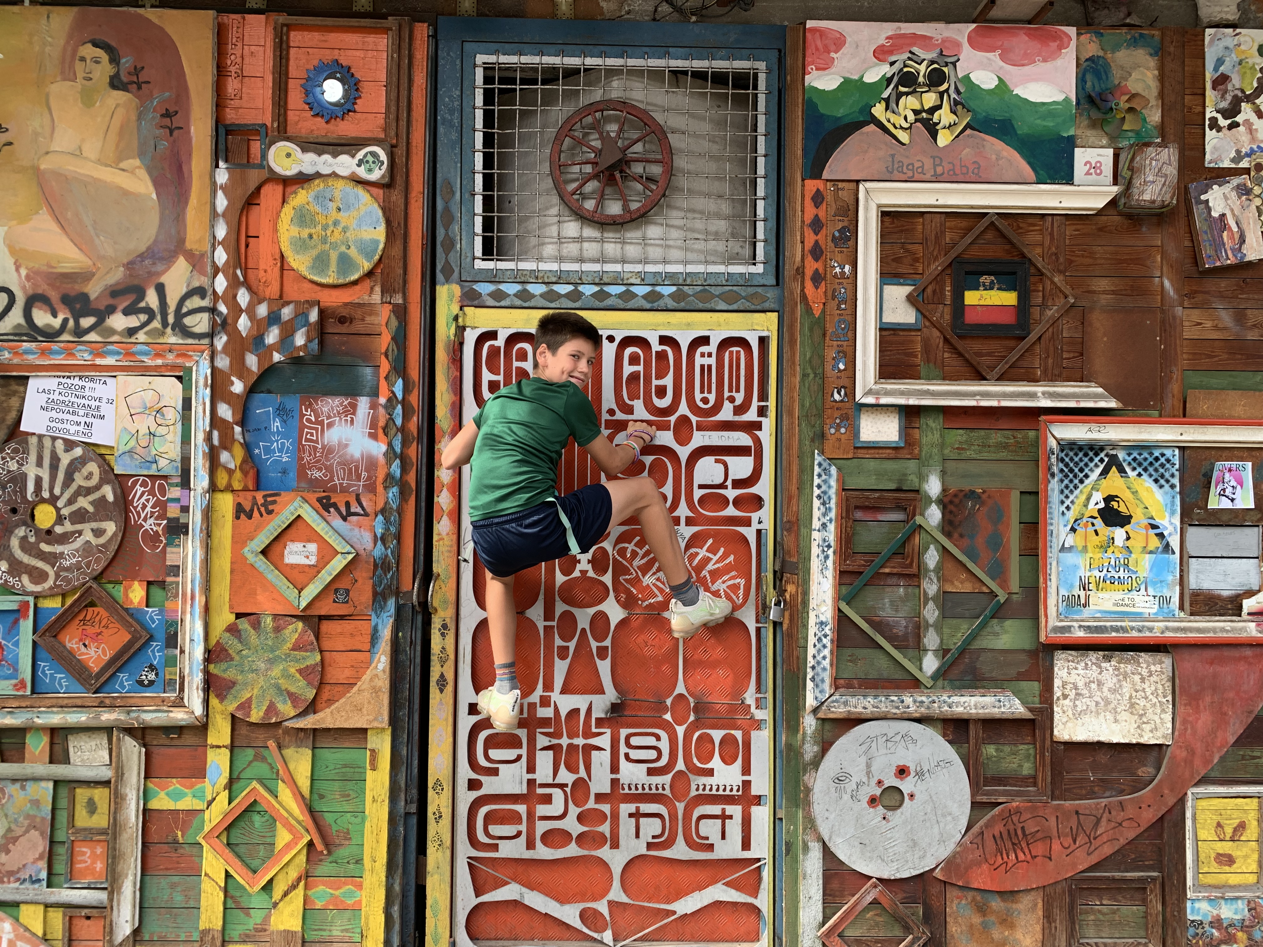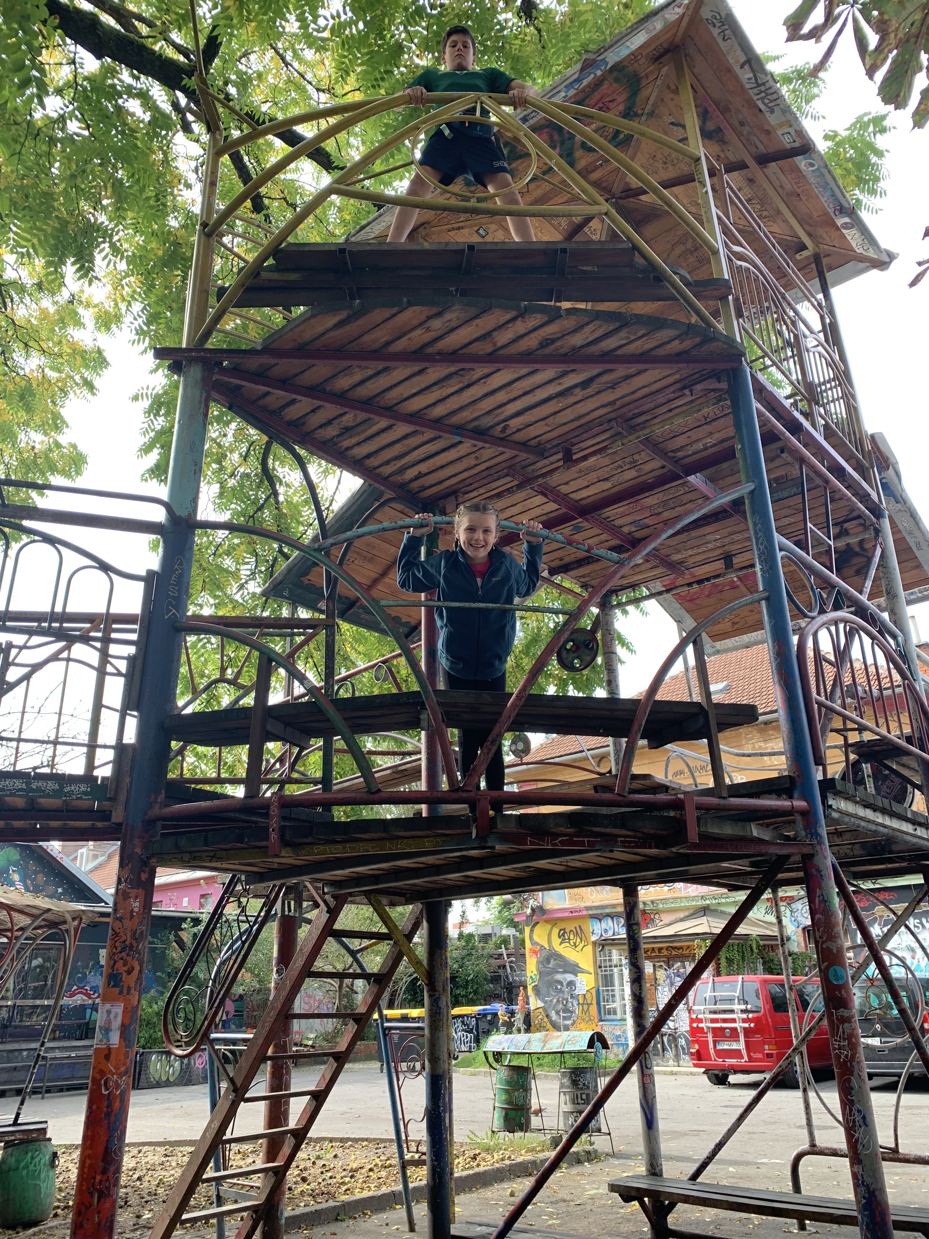Also in Ljubljana we walked around a neighborhood that was covered in spray paint. There was also a structure that was three stories tall and we played a game on it. Grant was the watcher, Mom was the bad girl and I was just running a muck making sure mom wasn’t about to attack us. At one point I was dangling from the structure because mom caught me by my ankles. It all ended well and I was safe. It was pretty cool and a little creepy. See below…..