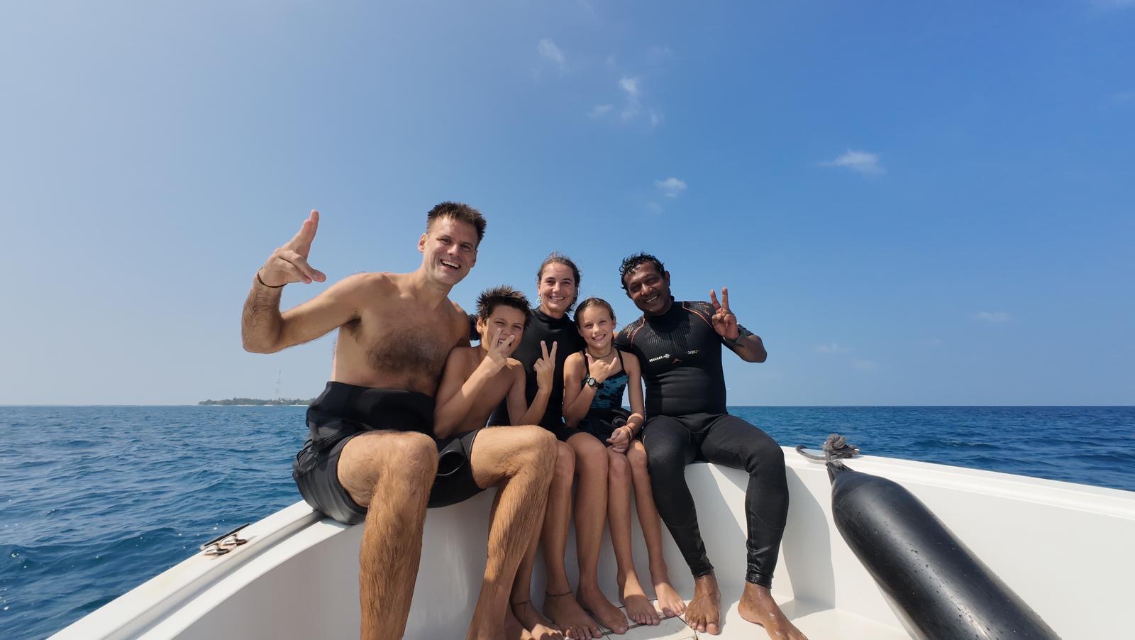 Before I knew it, our 30 min was over, and he gave me the “up” signal … not that I needed it cause I was already getting pulled up. We surfaced and we had to get out of our vest and air tank while in the water, before loading up into the boat. Then we climbed the ladder, sat in the bow, and talked about our experience. We got asked by our instructors how it was. At the time everyone was talking about how amazing it was. I agreed at the time, I thought it was so cool, to be underwater with everyone. But as I look back on things now I have to say that our Maldives diving experience wasn’t as fun as I was hoping, mainly because of the lack of freedom (see my post on surfing) resulting from having to be so close to Anjou. It definetly makes me want to try it again, once I can be on my own.