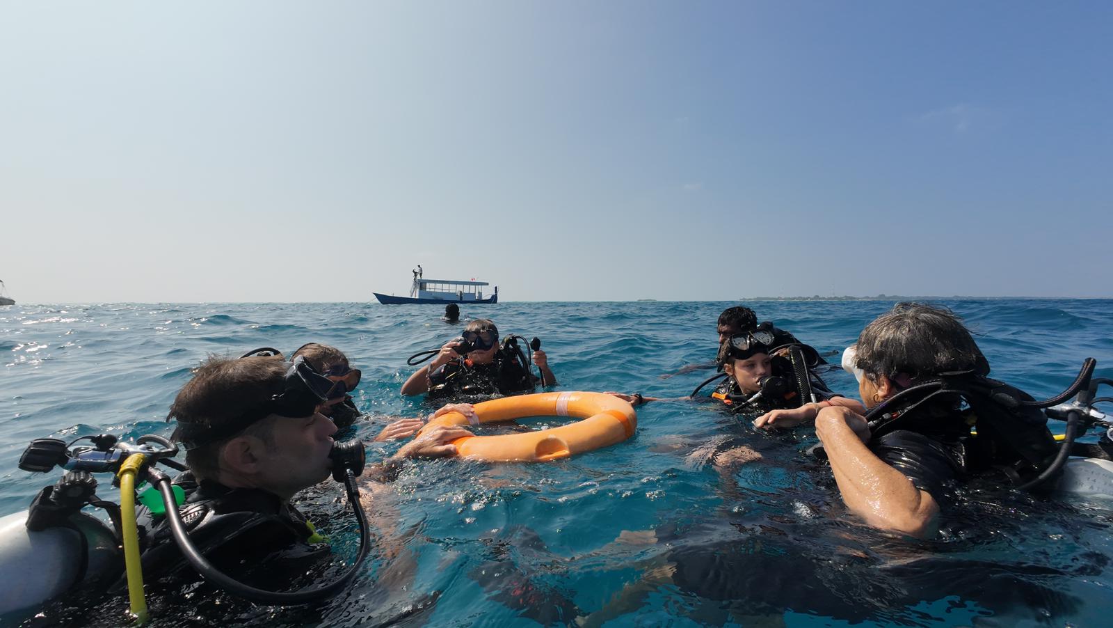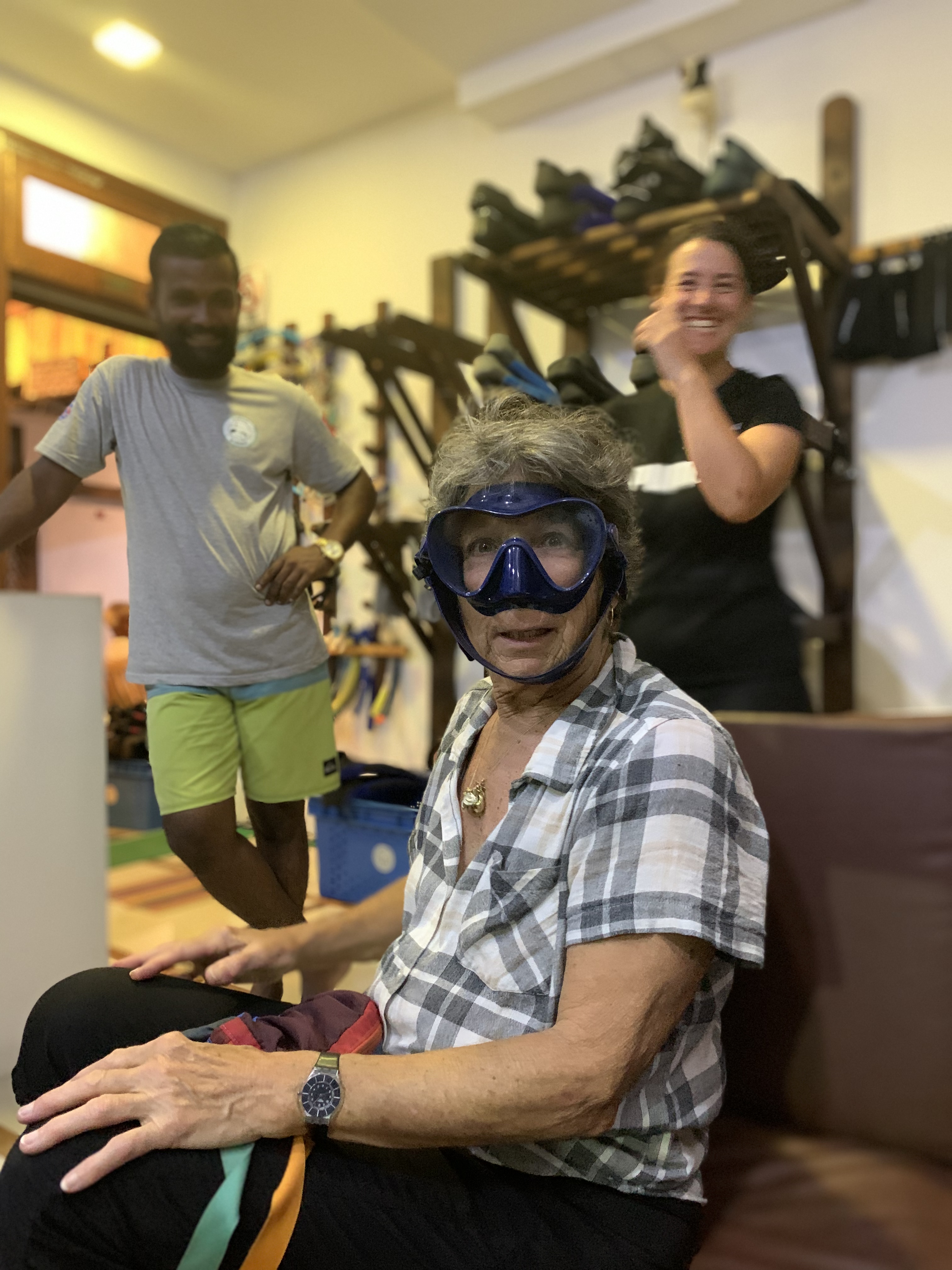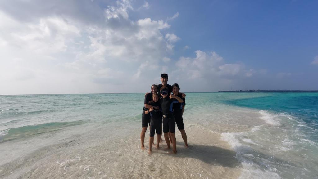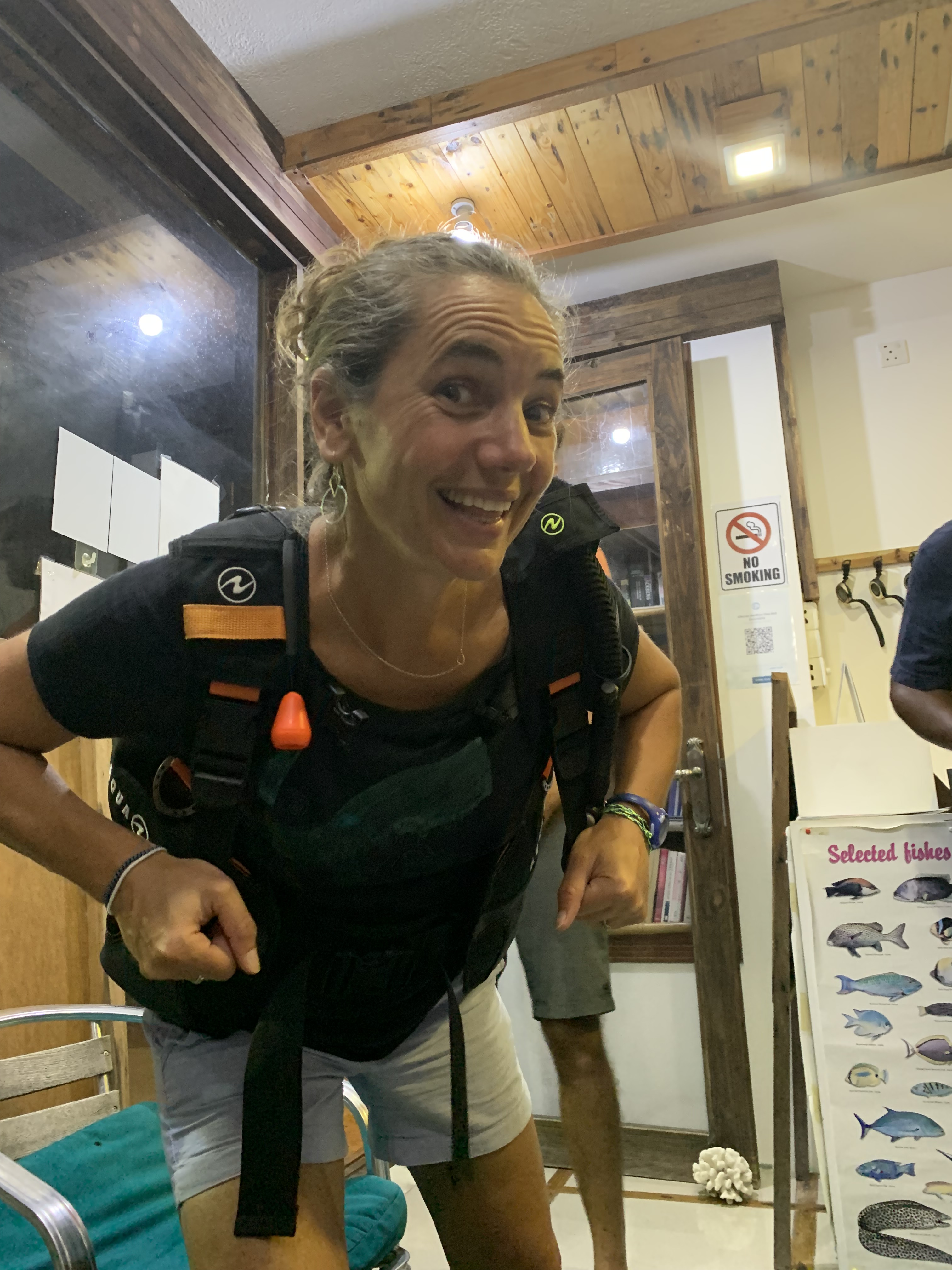 The night before our dive we met our leaders, Anjou and Senim. Anjou a local to Rasdhoo and Senim Divemaster student from Turkiye! We got fitted for wetsuits, flippers, goggles, and dive vests (which attaches oxygen tanks to us). We also watched a 15-min video which told us important hand signals like go up, go down, I’m OK, Not feeling good (then point to the area that doesn’t feel good), and my favorite one: “take it easy” … which requires both hands out in front of you, palms facing down, then slowly moving your hands down from chest height to waist height. We also learned THE MOST IMPORTANT THING, when scuba diving, “DON’T HOLD YOUR BREATH” … else your lungs could burst. A serious injury, but the easiest thing to prevent. Then we were sent away to get some sleep and get ready for tomorrow.